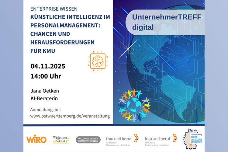 Die Kontaktstelle Frau und Beruf Ostwürttemberg und das Welcome Center Ostwürttemberg greifen im Rahmen ihrer gemeinsamen Online-Reihe für Unternehmen EnterPRISE Wissen und in Kooperation mit der Veranstaltungsreihe "UnternehmerTREFF digital" das Thema KI im Personalmanagement auf. Am 4. November 2025 wird die erfahrene KI-Beraterin Jana Oetken um 14:00 Uhr in einer Online-Veranstaltung anhand praxisnaher Beispiele aufzeigen, wie praxisorientierte KI-Tools (ChatGPT) besonders kleine und mittlere Unternehmen bei Recruiting, Onboarding und Personalentwicklung unterstützen können. Der Fokus liegt dabei auf internationalen Fachkräften und Frauen.