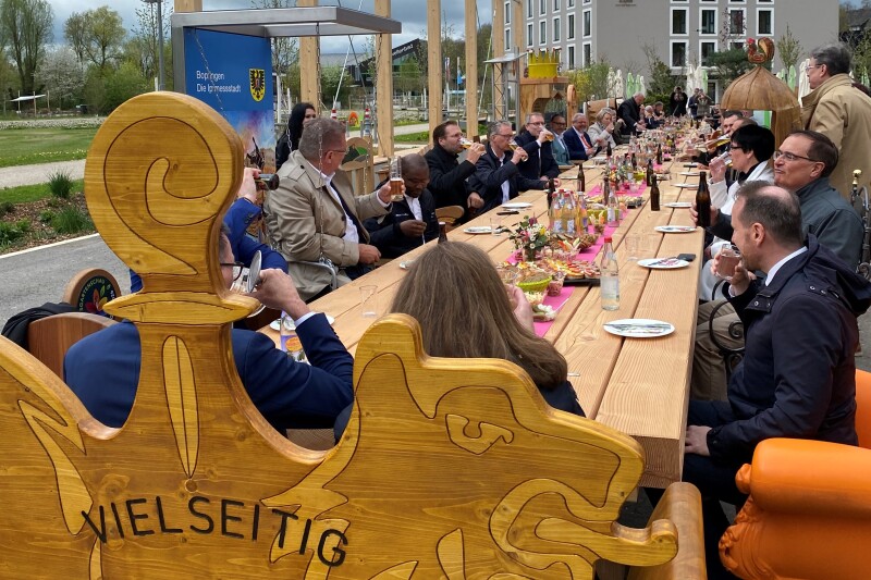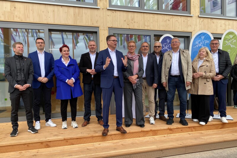 In seiner Begrüßung betonte Bläse: "Man spürt: Jetzt sind wir auf der Zielgeraden!“ Die Gartenschau komme angesichts der weltpolitischen Lage genau zur richtigen Zeit. Der Landrat dankte dem Kreistag für den Mut in diesen finanziell schwierigen Zeiten, der es ermöglicht habe, dass der Kreis sich in Ellwangen präsentieren und auch als Gastgeber fungieren könne. Ein weiteres Dankeschön richtete Bläse an die Erste Landesbeamtin Gabriele Seefried, die Gartenschau-Beauftragte Manuela Rathgeb und alle anderen Mitwirkenden des Kreises, die in die Vorbereitungen involviert waren. Dank ging auch an die Firma Holzbau Binz, die den Kreispavillon im Auftrag der Infrastrukturgesellschaft des Ostalbkreises bewusst in innovativer und nachhaltiger Holzbauweise in sehr kurzer Zeit erstellt und errichtet hat. Nach der Gartenschau wird der Pavillon als Erweiterungsbau für die kreiseigene Jagsttalschule in Westhausen eine Anschlussverwendung finden.
