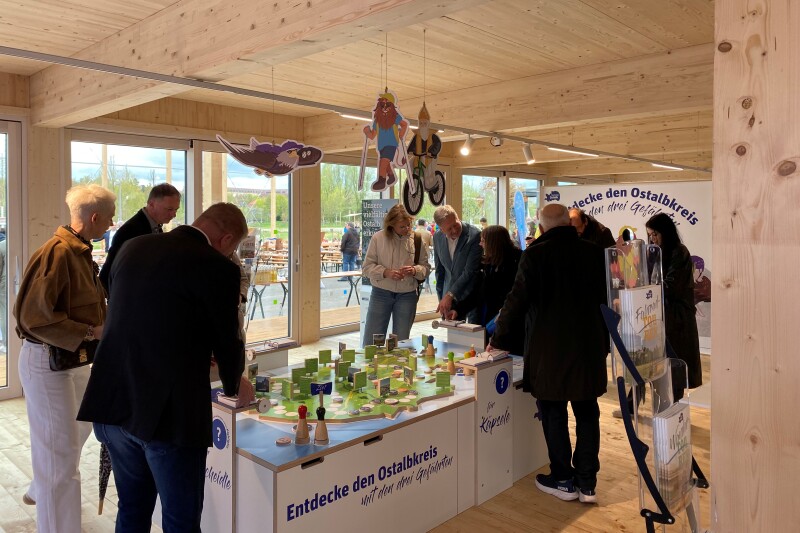 Vor rund 150 geladenen Gästen, darunter Kreistagsmitglieder, Vertreter der Gartenschau GmbH, von Firmen, Banken und vielen weiteren Organisationen und Institutionen, haben Landrat Dr. Joachim Bläse und Ellwangens Oberbürgermeister Michael Dambacher am vergangenen Sonntag (19.04.2026) wenige Tage vor Beginn der Landesgartenschau den Pavillon des Ostalbkreises offiziell eröffnet.