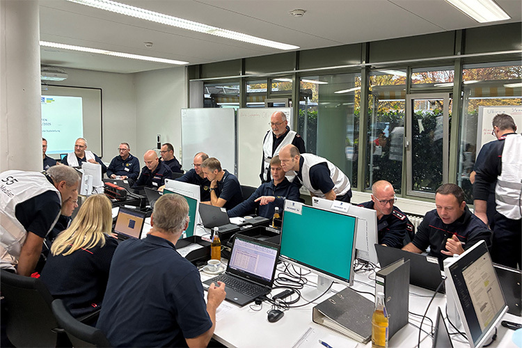 Dazu mussten im Übungsszenario vielfältige Aufgaben bearbeitet werden. Neben der frühzeitigen Warnung und Information der Bevölkerung, u.a. mittels Cell Broadcast, wurden die Feuerwehrhäuser als sogenannte „Leuchttürme“ aktiviert. Diese fungieren bei einem Ausfall der öffentlichen Kommunikationsnetze als Ersatz für Mobilfunk und Notruf. Auch galt es, resiliente Kommunikationskanäle zu den Führungsgruppen vor Ort und zur zuständigen Leitstelle des Netzbetreibers Netze ODR herzustellen. Zu klären war, welche kritische Infrastruktur – also beispielsweise Krankenhäuser, Alten- und Pflegeheime, Wasserversorger oder Kläranlagen – mit Notstromaggregaten versorgt werden müssen. Weitere Themenfelder waren die Einrichtung von mobilen Tankstellen, die Verkehrslenkung und Absicherung von Maßnahmen durch die Polizei und die Unterstützung durch das THW, etwa durch überregionale Bereitstellung von Stromerzeugern.