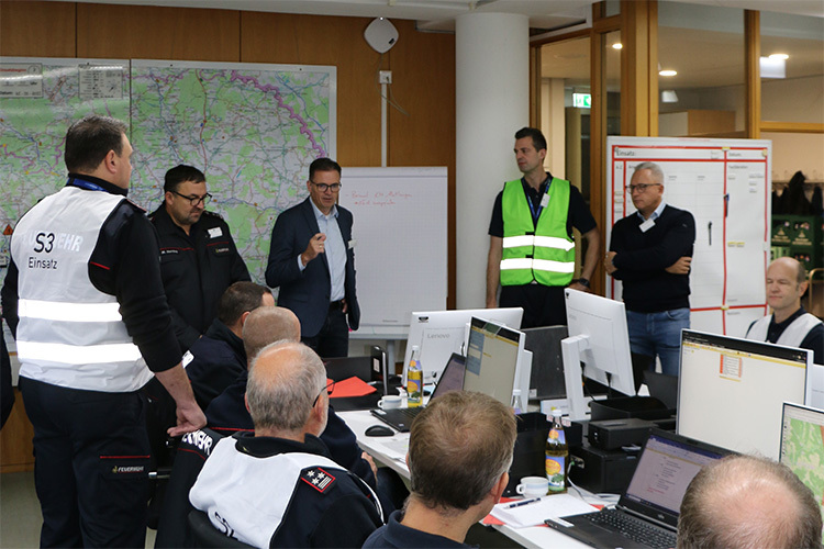Der Leiter des Führungsstabs Sebastian Ams machte deutlich, dass ein wichtiger Bestandteil der Arbeit des Führungsstabs die Fachberater der verschiedenen Hilfsorganisationen und Behörden seien. So waren das Technische Hilfswerk - THW, die Polizei, die Verbindungspersonen zur Integrierten Regionalleitstelle sowie die für diese Übungslage erforderlichen Fachberater der Netze ODR beteiligt. Die Zusammenarbeit der Akteure wurde ausgiebig getestet. "Das Know-how, die Erfahrung und die Verfügbarkeit des jeweiligen Equipments der Hilfsorganisationen, Behörden und Fachfirmen sind im Ernstfall von entscheidender Bedeutung", betont Sebastian Ams. "Deshalb bildet die Stabsleitung derzeit eine Fachberatergruppe, in der alle Fachberater kontinuierlich in den Übungsalltag des Führungsstabs eingebunden werden sollen", ergänzt Matthias Herdeg, stellvertretender Leiter des Führungsstabes.