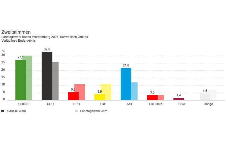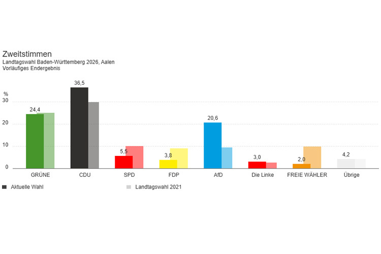 Der Wahltag selbst ist laut Bläse in allen Kommunen ordnungsgemäß und ohne nennenswerte Besonderheiten verlaufen. Von den 123.249 Wahlberechtigten im Wahlkreis Aalen haben 70,8 Prozent gewählt, 32.800 davon per Briefwahl. Damit ist die Wahlbeteiligung gegenüber der Landtagswahl 2021 um 6,95 Prozentpunkte gestiegen. Im Wahlkreis Schwäbisch Gmünd haben von 109.633 Wahlberechtigten 70,2 Prozent gewählt. Von der Briefwahl haben 26.857 Gebrauch gemacht. Die Wahlbeteiligung lag gegenüber 2021 um 6,07 Prozent höher.