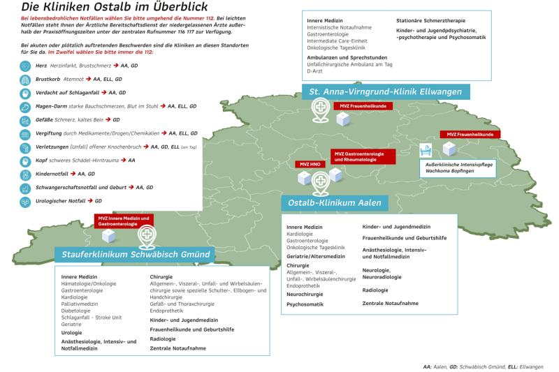 Anders sieht es bei Beschwerden aus, die zwar dringend erscheinen, aber nicht unmittelbar lebensbedrohlich sind. Dazu gehören Infekte, schon länger anhaltende Schmerzen oder leichtere Verletzungen. Der ärztliche Bereitschaftsdienst unter der Nummer 116 117 kann in diesen Fällen weiterhelfen, wenn zum Beispiel Beschwerden auftreten und der eigene Hausarzt nicht erreichbar ist. Erste Anlaufstellen sind in diesen Fällen die Bereitschaftspraxen der niedergelassenen Ärzte am Ostalb-Klinikum in Aalen und am Stauferklinikum in Mutlangen. Der kinderärztliche Notdienst steht an Samstagen am Ostalb-Klinikum und an Sonn- und Feiertagen am Stauferklinikum jeweils von 9:00 bis 20:00 Uhr zu Verfügung.